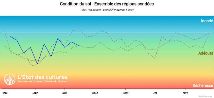 Malgré la dernière semaine très humide, de bonnes averses dans plusieurs régions, et même de la grêle signalée par un participant, notre indice général de la condition du sol a reculé un peu cette semaine d’« adéquat à trop humide » vers un sol jugé « adéquat ».