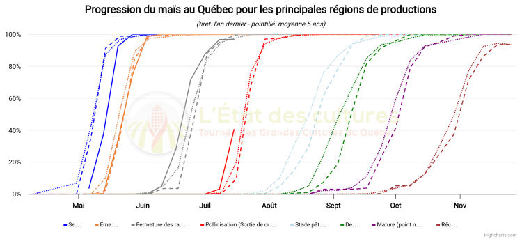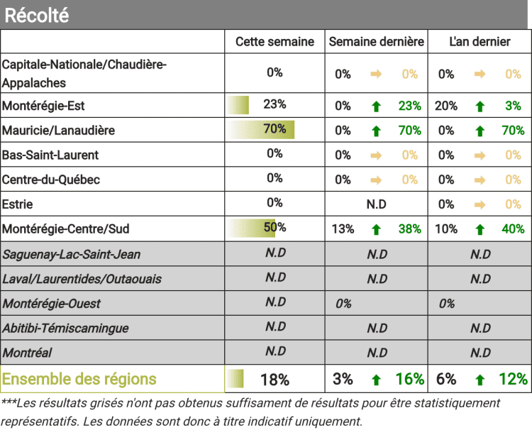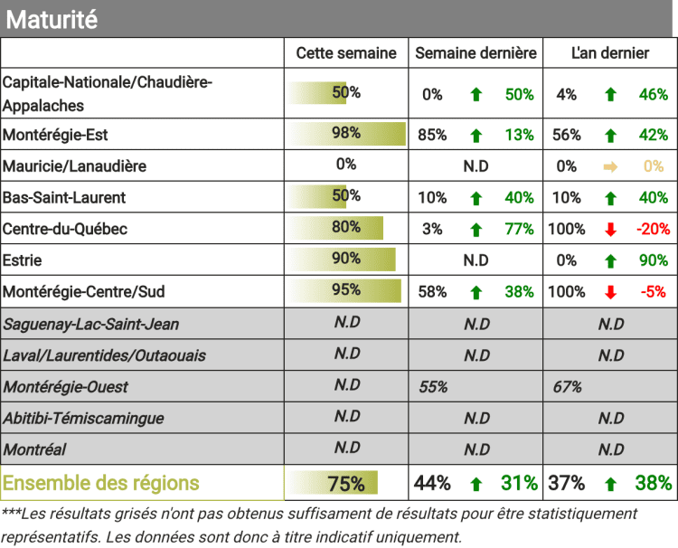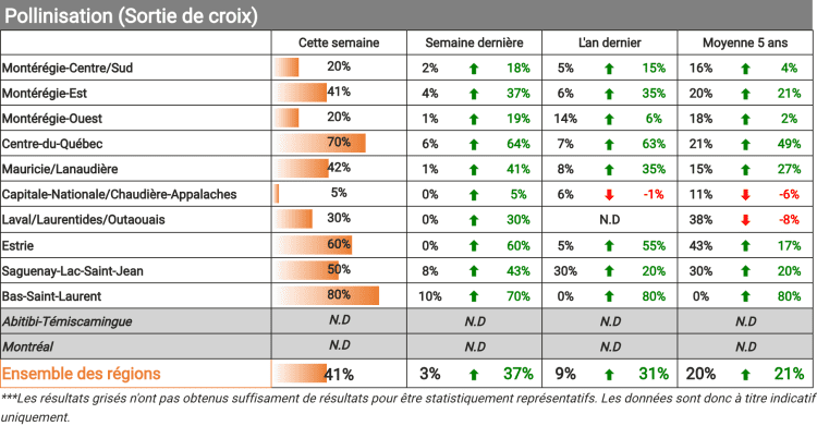 Dans le maïs, peut-être encore quelques champs dont les rangs restent à fermer (Capitale-Nationale/Chaudière-Appalaches), mais sinon le stade de la pollinisation est atteint à 40% pour l’ensemble des régions, une avance notable de 20% par rapport à la moyenne cinq ans. Quelques participants nous ont partagé aussi des images de petits épis qui révèlent un bon potentiel de rendement.