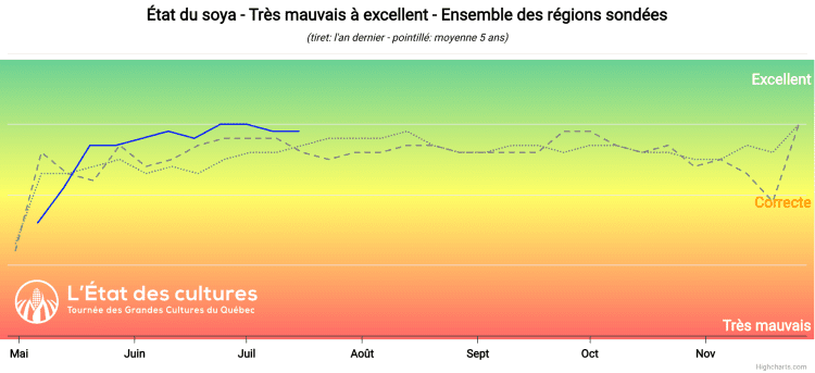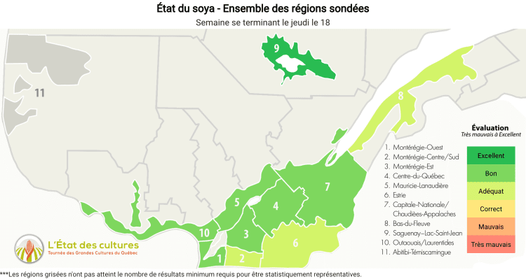 Dans le soya, l’état des cultures est resté sur le neutre, jugé toujours « bon ». Ce qui ressort cependant cette semaine est le nombre d’observations plus importantes de pucerons, mais aussi de premières mentions de chrysomèles du haricot, d’altises à tête rouge et de scarabées japonais. Les excès d’eau affectent aussi certains champs, comme dans le maïs.