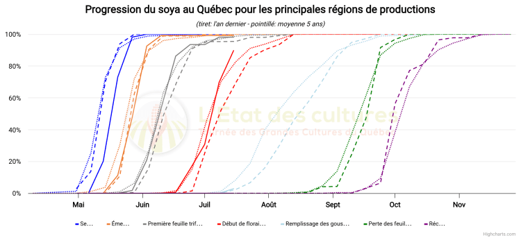 Le stade de la floraison a fait un bond de 20% dans la dernière semaine dans le soya, pour atteindre maintenant 90%, en avance aussi de 7% par rapport à la moyenne cinq ans.