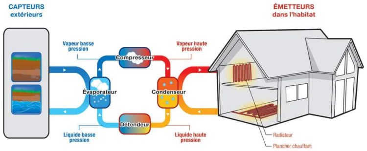 Les systèmes de chauffage géothermiques sont donc des systèmes qui ne requièrent aucune combustion, ce qui les caractérise comme étant des systèmes sécuritaires. Il existe deux principaux types de systèmes géothermiques: la boucle fermée verticale qui exige des puits forés verticalement (jusqu’à 150 mètres de profondeur) et la boucle fermée horizontale où les tuyaux sont enterrés à faible profondeur (environ à 2 mètres) sur une grande surface. Au Québec, la température du sol à partir de 2 mètres de profondeur reste stable au cours de l’année, autour de 8 à 10 °C, ce qui permet une utilisation constante de la géothermie.