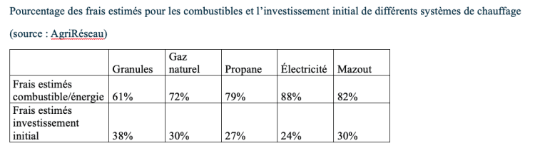 Le tableau ci-dessous montre en effet que les frais d’investissement d’un système à la biomasse utilisant des granules représenteront 38 % des frais totaux, ce qui représente la proportion la plus importante comparativement aux autres systèmes. Cependant, lorsque l’on compare les frais estimés pour les combustibles (ou l’énergie électrique), la biomasse représente la proportion la plus basse, ce qui peut être avantageux sur le long terme.