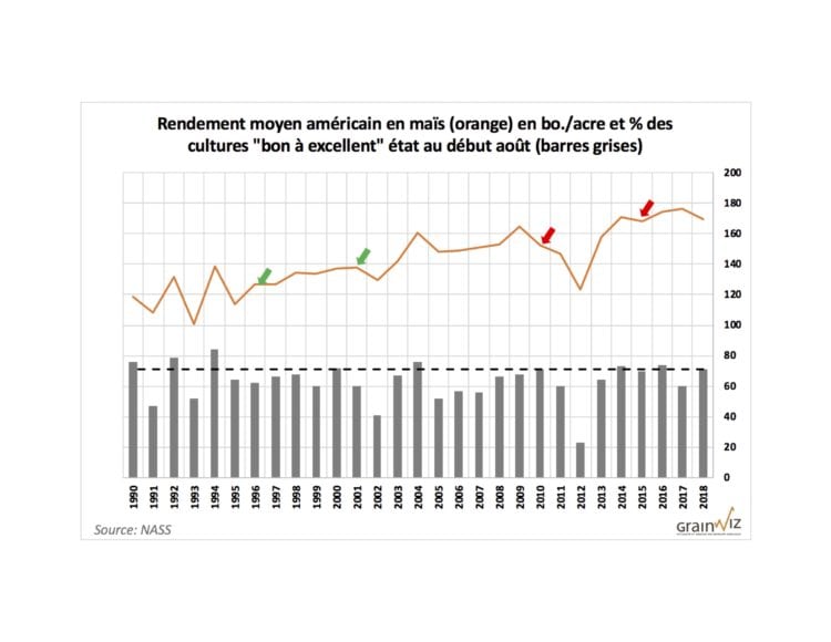 Ci-joint un graphique qui illustre bien le lien étroit entre état des cultures de maïs au début août, et le rendement moyen aux États-Unis à l’automne suivant.