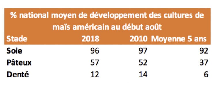 Si on jette un coup d’œil au tableau du stade de développement des cultures au début août, on remarque que tout comme pour 2018, 2010 était une année où le développement des cultures était beaucoup plus rapide qu’à la normale. En fait, grossièrement, les stades pâteux et denté étaient pratiquement atteints de 1½fois à 2 fois le pourcentage normal des 5 dernières années. Autrement dit, le développement des cultures serait essentiellement aussi anormalement rapide en 2018 qu’il ne l’a été en 2010. Or, 2010 n’a pas proposé un rendement record, mais plutôt un recul annuel du rendement moyen américain de maïs de 164,4 à 152,8 boisseaux/acre.