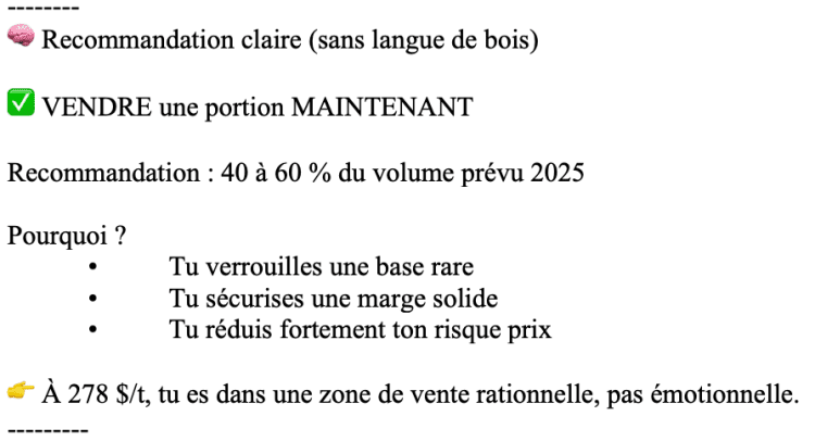 Maintenant, ce que j’en pense? Bien franchement, c’est assez incroyable. À lire sa réponse, je peux prendre ma retraite comme chroniqueur des marchés. ? C’est très complet et ma foi, je suis impressionné par le niveau de détail sur certains points qu’il a abordés pour en arriver à sa recommandation. Il a évalué la « base », propose des % de ventes à atteindre, analyse le contexte global du marché du maïs, etc. Bref, c’est quand même très complet, assez pour me convaincre qu’on devrait effectivement vendre du maïs maintenant.