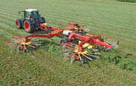 L’andaineur à quatrerotors Top 1252 Hybridese déploie sur 12,5 m.L’entraînement hydrauliquedes deux rotorsavant et l’entraînementmécanique de ceuxarrière permettentun repliage « en ailesd’oiseau » sur une hauteurde 4 m. On passe duchamp à la route sansdescendre du tracteur.