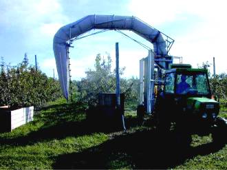 Des chercheurs du Centre de recherche et développement en horticulture de Saint-Jean-sur-Richelieu et de la Faculté des sciences de l’agriculture et de l’alimentation ont conçu un nouveau pulvérisateur pour les vergers, vignes et arbustes. Sa longue rampe de pulvérisation peut passer au-dessus des pommiers nains et semi-nains et effectuer la pulvérisation dans un angle de 10 degrés vers le sol. Un collecteur de gouttelettes récupère une partie des pesticides non utilisés.