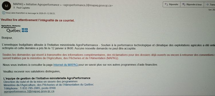 Comme plusieurs, j’ai mis du temps à préparer mes demandes pour être fin prêt pour le nouveau programme AgroPerformance. Un programme à la base intéressant qui laisse place à certaines bonifications pour la relève agricole, les exploitations agricoles situées dans les régions périphériques, les exploitations agricoles qui disposent d’un plan climat réalisé dans le cadre du programme Agriclimat ou en phase de pré-certification biologique et même biologique.