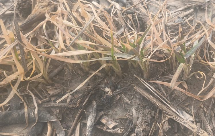 Lundi matin, je me retrouve au champ afin d’évaluer la vitesse des vents. Trop venteux pour effectuer le semis par drone, mais j’en profite pour réévaluer l’évolution de la couronne de croissance. Eh boy! Le champ est encore plus amoché que la semaine dernière. Le blé semble avoir mangé toute une volée. Des sections brunes des sections plus vertes.
