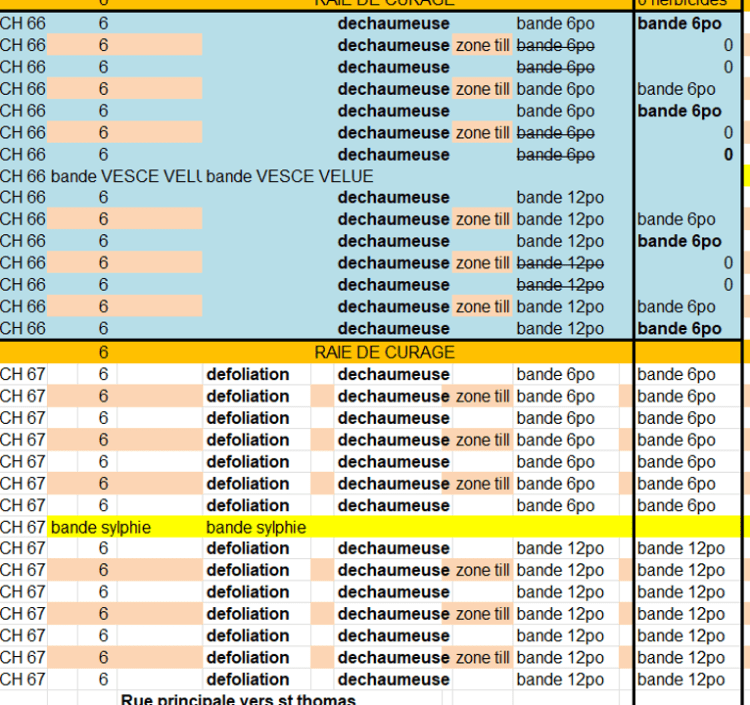 On projette procéder à une pulvérisation en bande de 12 pouces et essayer même 6 pouces seulement de large, considérant que les équipements de sarclage sont très performants. Une pulvérisation de 6 pouces, ça représente 80% de réduction des herbicides. On passe donc les étapes du semis en respectant le schéma planifié. Schéma qui inclut plusieurs variables entre des bandes avec passages de strip till versus sans strip till.